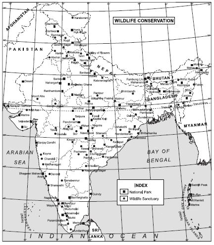 Location of Wildlife Sanctuaries and National parks on the map of India: