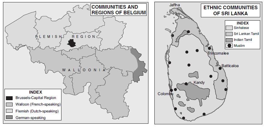 Look at the maps of Belgium and Sri Lanka (given below). In which region do you find the concentration of different communities.