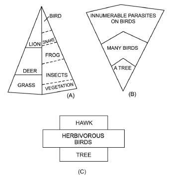 (1) Pyramid of number. Pyramid is the mathematical representation of number of organisms