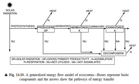 ecosystem, nutrients are used again and again in a cyclic manner, whereas energy trapped