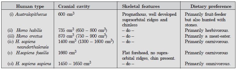 their brain size (cranial cavity), skeletal features, dietary preference, etc., as shown in