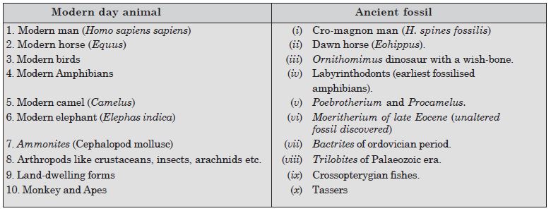 List a few modern day animals and from internet link to corresponding ancient fossil. Name both.