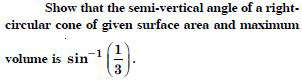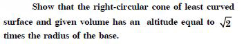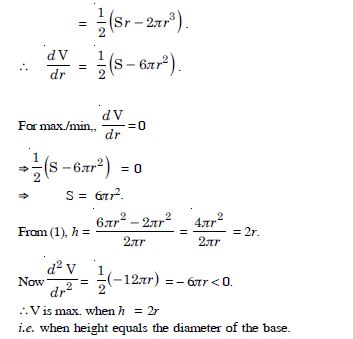 Show that the right circular cylinder of given surface and maximum volume is such that its height is equal to the diameter of the base.