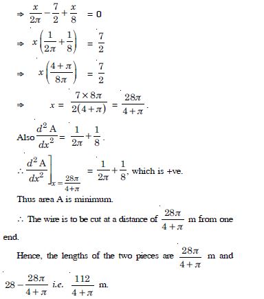 A wire of length 28 cm is to be cut into two pieces. One of the pieces is to be made into a square and other into a circle. What could be the lengths of the two pieces so that the combined area of the square and the circle is minimum ?