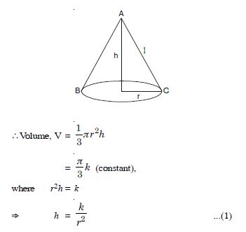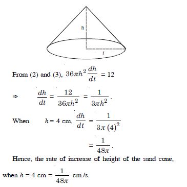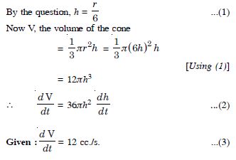 Sand is pouring from a pipe at the rate of 12 cc/s. The falling sand forms a cone on the ground in such a way that the height of the cone is always onesixth of the radius of the base. How fast is the height of the sand cone increasing when the height is 4 cm ?