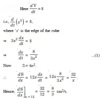 The volume of a cube is increasing at the rate of 8 cm3/s. How fast is the surface area increasing when the length of the edge is 12 cm ?