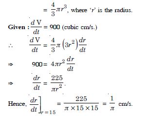 A balloon, which always remains spherical, is being inflated by pumping in 900 cubic centimeters of gas per second. Find the rate at which the radius of the balloon is increasing when the radius is 15 cm.