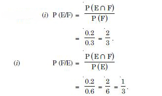 P (E) = 0.6, P(F) = 0.3 and P (E ∩ F) = 0.2 find P (E/F) and P (F/E).