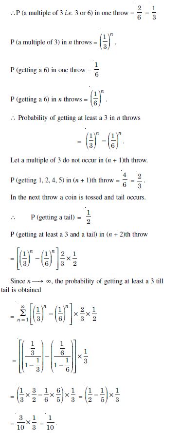 Consider the experiment of throwing a die, if a multiple of 3 comes up, throw the die again and if any other number comes, toss a coin. Find the conditional probability of the event ‘the coin shows a tail’, given that ‘at least the die shows 3’.