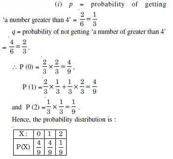 Find the probability distribution of the number of successes in two tosses of a die when a success is defined as (i) ‘a number greater than 4’ (ii) six appears on at least one die.