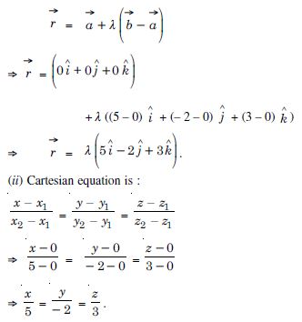 Find the vector and cartesian equations of the line that passes through the origin and (5, –2, 3).