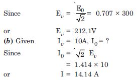 (b) The rms value of current in an a.c. circuit is 10 A. What is the peak current ?