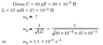 A charged 30 F, capacitor is connected to a 27 mH inductor. What is the angular frequency of free oscillations of the circuit ?