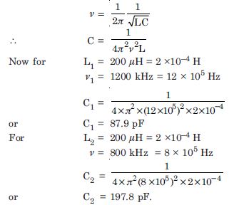 A radio can tune over the frequency range of a portion of MW broadcast band : (800 kHz to 1200 kHz). If its circuit has an effective inductance of 200 μH, what must be the range of its variable capacitor ? [Hint. For tuning, the natural frequency i.e., the frequency of free oscillations of the LC circuit should be equal to the frequency of the radio wave.]