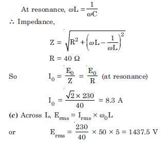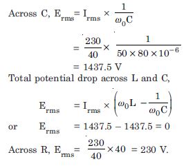 Determine the rms potential drop across the three elements of the circuit. Show that the potential drop across the LC combination is zero at the resonating frequency.
