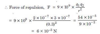 Given q1 = 2 × 10–7 C, q2 = 3 × 10–7 C, r = 30 cm = 0.3 m