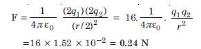 (b) When each charge is doubled and the distance between them is reduced to half, then