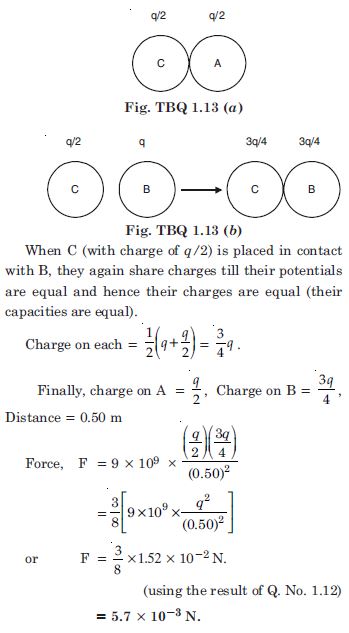 Let A and B be two given spheres each having charge q = 6.5 × 10–7 C. When another sphere say C is placed in contact with the sphere A, the two will distribute the charges equally, Fig. TBQ 1.13 (a).