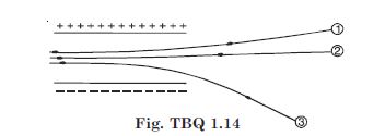 Figure TBQ 1.14 gives tracks of three charged particles in a uniform electrostatic field. Give the signs of the three charges. Which particle has the highest charge to mass ratio ?