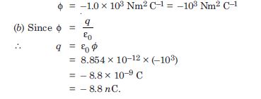 A point charge causes an electric flux of –1.0 × 103 N m2 C–1 to pass through spherical gaussian surface of 10.0 cm radius centred on the charge.