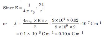 An infinite line charge produces a field of 9 × 104 NC–1 at a distance of 2 cm. Calculate the linear charge density.