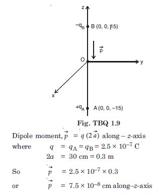 A system has two charges qA = 2.5 × 10–7 C and q B = –2.5 × 10–7 C located at A : (0, 0, –15 cm) and B : (0, 0, +15 cm) respectively. What is the total charge and electric dipole of the system ?