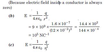 A spherical conductor of radius 12 cm has a charge of 1.6 × 10–7 C distributed uniformly on its surface. What is the electric field