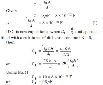 A parallel plate capacitor with air between the plates has a capacitance of 8pF (1pF = 10–12 F). What will be the capacitance if the distance between the plates is reduced by half, and the space between them is filled with a substance of dielectric constant 6 ?