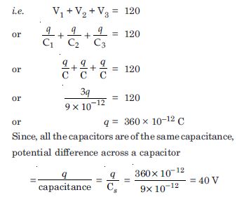 Given C 1= C 2= C 3 = 9 pF = 9 × 10 –12 F; V = 120 volt.