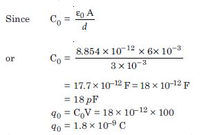 In a parallel plate capacitor with air between the plates, each plate has an area of 6 × 10–3 m2 and the distance between the plates is 3 mm. Calculate the capacitance if this capacitor is connected to a 100 V supply, what is the charge on each plate of the capacitor ?