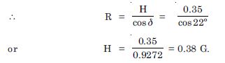 A magnetic needle free to rotate in a vertical plane to the magnetic meridian has its north tip pointing down at 22 with the horizontal. The horizontal component of the earth’s magnetic field at the place is known to be 0.35 G. Determine the magnitude of the earth’s magnetic field at the place.