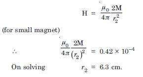 A short bar magnet has a magnetic moment of 0.48 JT–1. Give the direction and magnitude of the magnetic field produced by the magnet at a distance of 10 cm from the centre of the magnet on (i) the axis (ii) the equatorial line (normal bisector) of the magnet. Ans. Given M = 0.48 JT–1, d = 10 cm B = ? (i) Along the axis (for a short dipole)