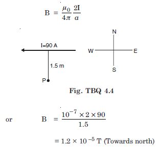 A horizontal overhead power line carries a current of 90 A in east to west direction. What is the magnitude and direction of the magnetic field due to the current 1.5 m below the line ?